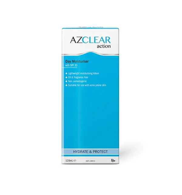 Azclear Action Day Moisturiser is a lightweight moisturising lotion suitable for use with acne prone skin. The oil-free formula hydrates skin won't block pores and the SPF30 broad spectrum sunscreen helps to protect the skin from the damaging effects of the sun.