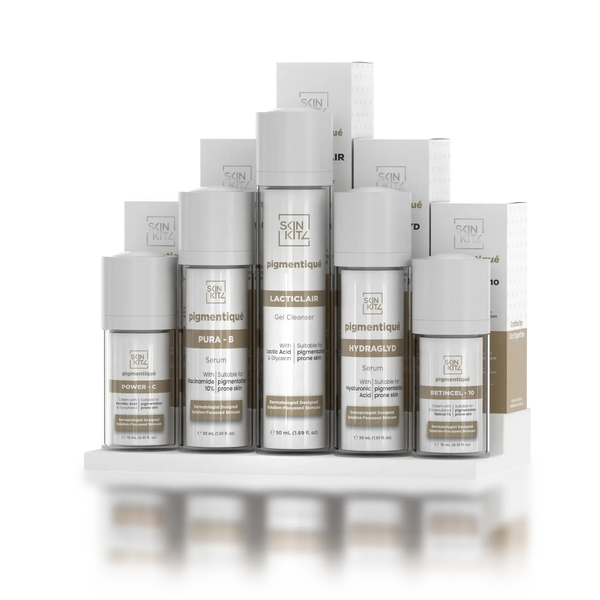 The SkinKitz Pigmentiqué Kit includes 5 products, including Pigmentiqué Hydraglyd Serum, Pigmentiqué Pura-B Serum, Pigmentiqué Lacticlair Gel Cleanser, Pigmentiqué Retincel-10 Cream and Pigmentiqué Power-C Cream.
