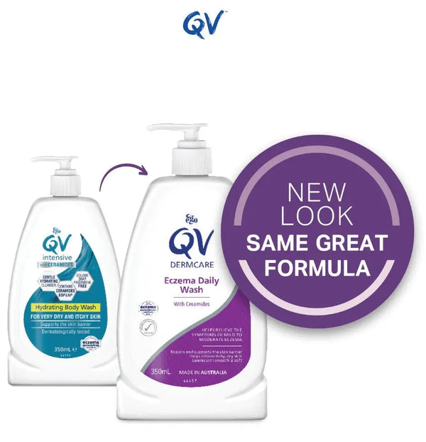 QV Dermcare Eczema Daily Wash is a therapeutic cleanser. Scientifically formulated with moisturisers and ceramides; together they help to improve the skin barrier function and relieve the symptoms of mild to moderate eczema. The pH-balanced, soap-free formula hydrates as it cleanses, creating a protective barrier to help retain moisture. Previously QV Intensive with Ceramides - New look, same great formula. Following the completion of a study on moderate eczema patients, and its latest therapeutic medical device registration, QV Intensive with Ceramides Hydrating Body Wash has a brand new name and look, introducing QV Dermcare Eczema Daily Wash.