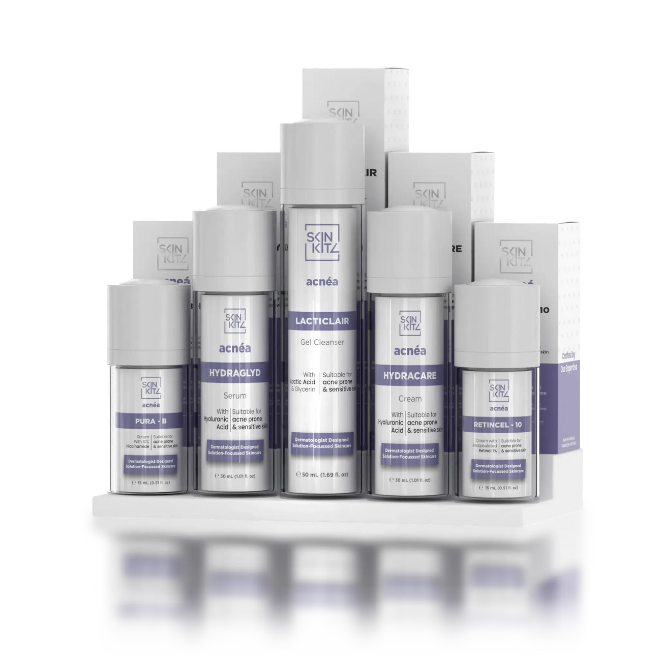 The SkinKitz Acnéa Kit includes 5 products, including Acnéa Hydraglyd Serum, Acnéa Retincel-10 Cream, Acnéa Pura-B Serum, Acnéa Hydracare Moisturising Cream and Acnéa Lacticlair Gel Cleanser.