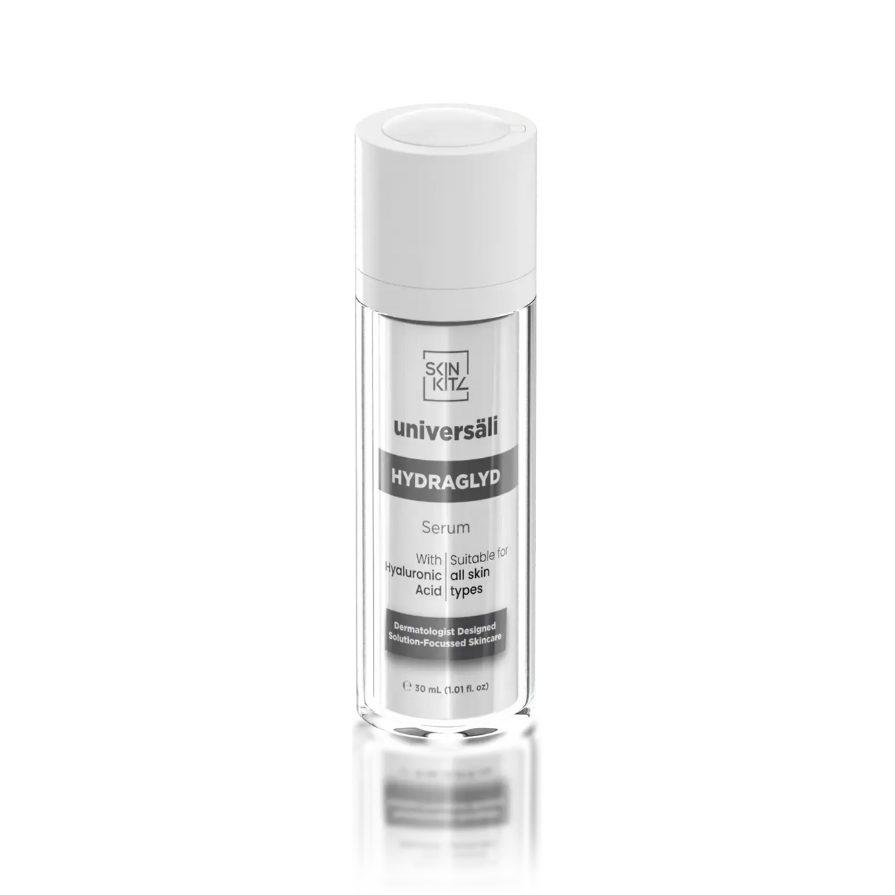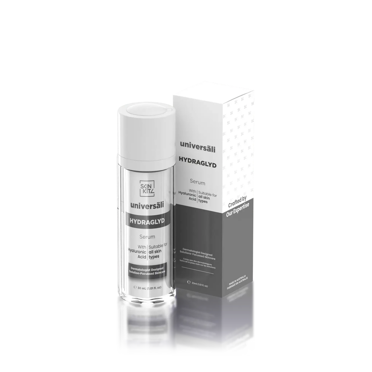 Universäli Hydraglyd Serum is our hyaluronic acid serum that brings together the hydration benefits of multiple types of hyaluronic acid in a non-occlusive serum. The inclusion of various forms of hyaluronic acid enhances its ability to attract and retain moisture at different skin layers, ensuring deeper and more sustained hydration. The formula ensures that your skin remains breathable while remaining compatible with other skincare products in the Universäli range. This unique serum is designed to be lightweight and non-greasy, moisturising the skin by attracting water from deeper layers of the skin. By incorporating Universäli Hydraglyd Serum into your daily skincare routine, you can provide hydration to your skin while fostering a healthy complexion that feels soft, supple, and well-nourished. Hydraglyd is designed to be suitable for use in combination with all other products in the Universäli range.